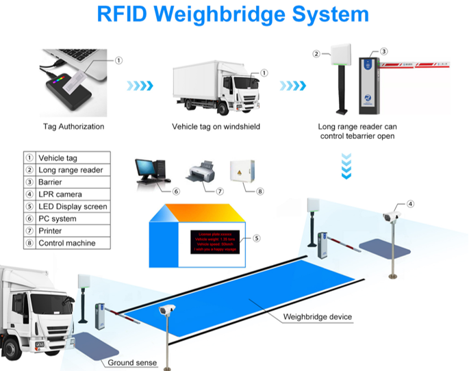 Weighbridge in and out of the vehicle installed in our UHF Integrated Reader, it can be connected to the road gate through the relay interface, through the ground sensor triggered by reading the card to open the gate, and will be read by the tag through the network remotely sent to the server, there are 6 meters, 10 meters, 15 meters of different reading distance can be selected.